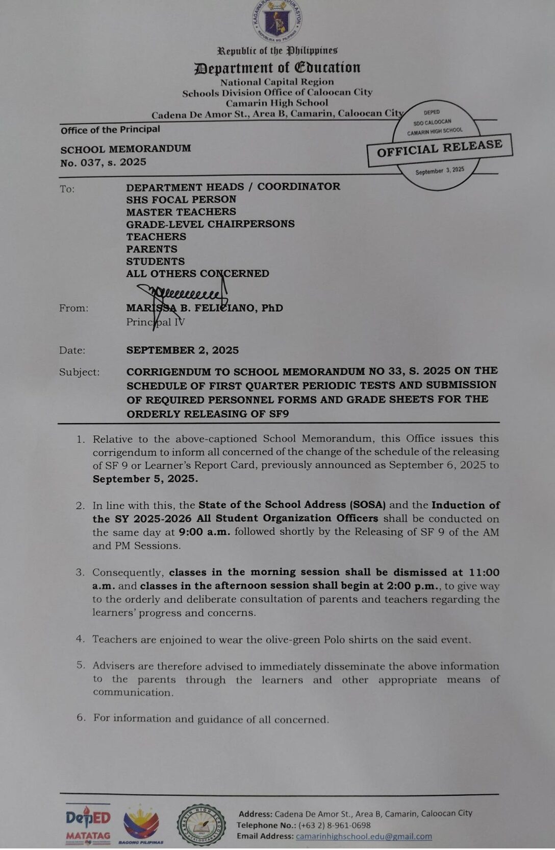 SCHOOL MEMORANDUM No. 037, s. 2025 – CORRIGENDUM TO SCHOOL MEMORANDUM NO. 33, S. 2025 ON THE SCHEDULE OF THE FIRST PERIODICAL TESTS AND SUBMISSION OF REQUIRED PERSONNEL FORMS AND GRADE SHEETS FOR THE ORDERLY RELEASING OF SF9 Posted on October 1, 2025 by CAMARINHSadmin-ICT